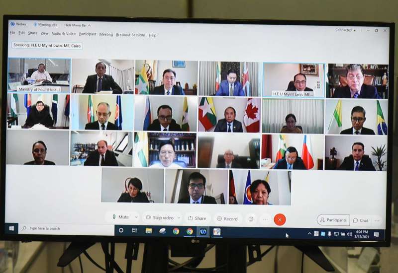 နိုင်ငံခြားရေး ဝန်ကြီးဌာန ပြည်ထောင်စုဝန်ကြီး ဦးဝဏ္ဏမောင်လွင်နှင့် အပြည်ပြည်ဆိုင်ရာ ပူးပေါင်းဆောင်ရွက်ရေး ဝန်ကြီးဌာန ပြည်ထောင်စုဝန်ကြီးဦးကို ကိုလှိုင်တို့ဦးဆောင်၍ အရှေ့ အလယ်ပိုင်းနှင့် အာဖရိကဇုန်၊ ဥရောပဇုန်၊ အမေရိကဇုန်နိုင်ငံများရှိ မြန်မာသံရုံးနှင့် အဖွဲ့ရုံးများမှ မြန်မာ သံအမတ်ကြီးများ၊ အမြဲတမ်း ကိုယ်စားလှယ်များနှင့် သံရုံးအကြီးအကဲများကို လက်ရှိဖြစ်ပေါ် တိုးတက်လျက်ရှိသော နိုင်ငံရေး အခြေအနေများနှင့် ဆောင်ရွက်ချက်များအား အသိပေးရှင်းလင်းခြင်း ညှိနှိုင်း အစည်းအဝေးကို ယနေ့ ညနေ ၄ နာရီတွင် ဗီဒီယိုကွန်ဖရင့်စနစ် ဖြင့် နိုင်ငံခြားရေးဝန်ကြီးဌာန ဧရာဝတီခန်းမ၌ ကျင်းပသည်။