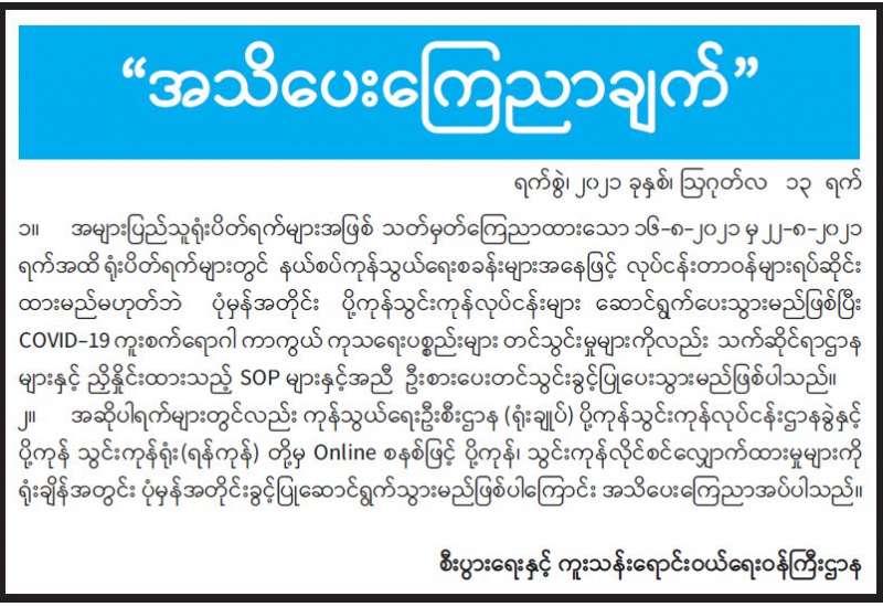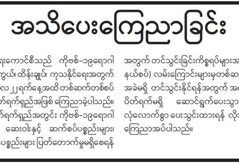 ကျန်းမာရေးဝန်ကြီးဌာနအနေဖြင့် နိုင်ငံအတွင်း ကူးစက်ဖြစ်ပွားနေသော COVID-19 ရောဂါ ကာကွယ်၊ ကုသ၊ ထိန်းချုပ်ရေးလုပ်ငန်းများကို အရှိန်အဟုန်မြှင့်ဆောင်ရွက်လျက်ရှိရာ ရောဂါထိန်းချုပ်ရေးလုပ်ငန်းများ အောင်မြင်နိုင်ရေးအတွက် ပြည်သူလူထုအနေဖြင့် -