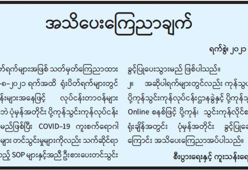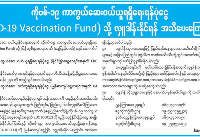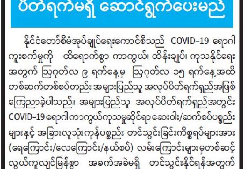 နိုင်ငံတော်အတွင်း၌ ကိုဗစ်-၁၉ ကာကွယ်၊ ထိန်းချုပ်၊ ကုသရေးလုပ်ငန်းများအတွက် အရေးတကြီး လိုအပ် လျက်ရှိသည့် အောက်ဆီဂျင်အရည်၊ အောက်ဆီဂျင် ဓာတ်ငွေ့၊ အိမ်သုံးအောက်ဆီဂျင်စက်၊ ဆေးဝါး နှင့် ဆက်စပ်ပစ္စည်းများ ပြတ်လပ်မှုမရှိစေရန် အများပြည်သူ ရုံးပိတ်ရက်များတွင် လေကြောင်း၊ ရေကြောင်းနှင့် နယ်စပ်ကုန်သွယ်ရေးစခန်းများမှ စဉ်ဆက်မပြတ် တင်သွင်းနိုင်ရေးအတွက် စီးပွားရေးနှင့် ကူးသန်းရောင်းဝယ်ရေးဝန်ကြီးဌာနမှ ဆောင်ရွက်ပေးလျက်ရှိသည်။