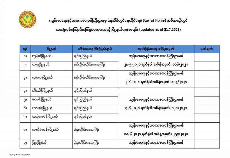 နိုင်ငံတော်အတွင်း၌ ကိုဗစ်-၁၉ ကာကွယ်၊ ထိန်းချုပ်၊ ကုသရေးလုပ်ငန်းများအတွက် အရေးတကြီး လိုအပ်လျက်ရှိသည့် အောက်ဆီဂျင်အရည်၊ အောက်ဆီဂျင်ဓာတ်ငွေ့၊ အိမ်သုံး အောက်ဆီဂျင်စက်နှင့် ဆေးဝါးနှင့်ဆက်စပ်ပစ္စည်းများပြတ်လပ်မှုမရှိစေရန် အများပြည်သူ ရုံးပိတ်ရက်များအဖြစ် သတ်မှတ်ကြေညာထားသည့် ဩဂုတ် ၂ ရက်မှ ၈ ရက်အထိ ရုံးပိတ်ရက်များ