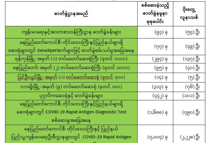 (၃၁-၇-၂၀၂၁)ရက်နေ့၊ ည (၈:၀၀)နာရီမှ (၁-၈-၂၀၂၁)ရက်နေ့၊ ည (၈:၀၀)နာရီအတွင်း ဓာတ်ခွဲနမူနာစုစု ပေါင်း(၁၀,၀၂၀)ခုအား စစ်ဆေးပြီးစီးခဲ့ရာCOVID-19 ရောဂါဓာတ်ခွဲ အတည်ပြုလူနာ သစ်(၃,၄၈၀)ဦးတွေ့ ရှိရပါသည်။ သို့ဖြစ်ပါ၍ ယနေ့အထိ ဓာတ်ခွဲနမူနာစုစုပေါင်း(၃,၁၆၉,၄၆၅)ခုအား စစ်ဆေးခဲ့ပြီး COVID-19 ဓာတ်ခွဲအတည်ပြုလူနာ စုစုပေါင်း (၃၀၂,၆၆၅) ဦး ရှိပြီ ဖြစ်ပါသည်။
