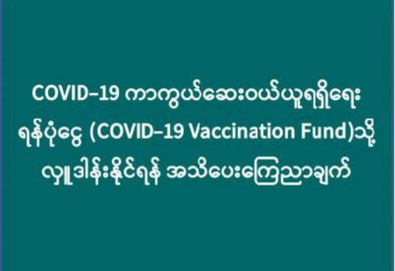 ၁။ ကိုဗစ်-၁၉ ကာကွယ်ဆေးဝယ်ယူနိုင်ရေးအတွက် ကိုဗစ်-၁၉ ကာကွယ်ဆေးဝယ်ယူရရှိရေး ရန်ပုံငွေ (CoVID-19 Vaccination Fund)ကို မြန်မာ့စီးပွားရေးဘဏ်(နေပြည်တော်)တွင် အောက်ပါအတိုင်း ဖွင့်လှစ်ထားပါသည်-