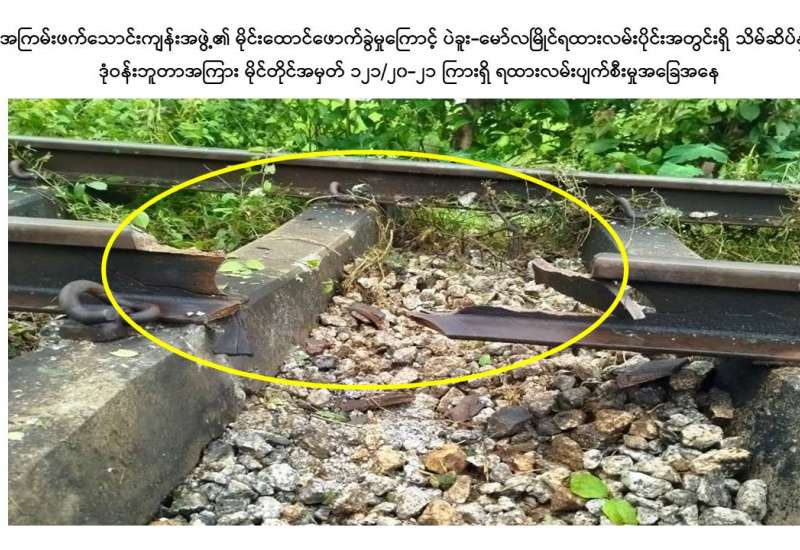 ယမန်နေ့ စက်တင်ဘာ ၂၆ ရက်နေ့ ည ၈ နာရီခွဲအချိန်ခန့်တွင် မွန်ပြည်နယ်၊ သထုံမြို့နယ်၊ သိမ်ဆိပ်ဘူတာနှင့် ဒုံဝန်းဘူတာအကြား၊ ပဲခူး-မော်လမြိုင် ရထားလမ်းပိုင်းအတွင်း မိုင်တိုင်အမှတ် ၁၂၁/၂၀-၂၁ ကြားရှိ ရထားသံလမ်းအား အကြမ်းဖက်သောင်းကျန်းသူအဖွဲ့က မိုင်းဖြင့်ဖောက်ခွဲဖျက်ဆီးထားသဖြင့် ရထားလမ်းထိခိုက်ပျက်စီးခဲ့ပြီး သိမ်ဆိပ်နှင့် ဒုံဝန်းအကြား ရထားလမ်းပိုင်းအား ယနေ့နံနက်ပိုင်းတွင် ယာယီပိတ်ထားရကြောင်း သိရှိရသည်။