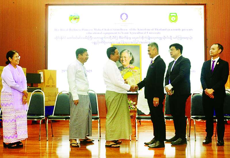 ထိုင်းနိုင်ငံ တော်ဝင်မင်းသမီးကြီး မဟာချက်ကရီသီရိဒုံစီမံကိန်းမှ သင်ကြားရေးနှင့် ရုံးလုပ်ငန်းပစ္စည်းကိရိယာများ လှူဒါန်းပေးအပ်ခြင်းအခမ်းအနားကို ယမန်နေ့ မွန်းလွဲပိုင်းတွင် ရေဆင်းစိုက်ပျိုးရေးတက္ကသိုလ် ရာပြည့်ခန်းမ၌ ကျင်းပရာ စိုက်ပျိုးရေး၊ မွေးမြူရေးနှင့် ဆည်မြောင်းဝန်ကြီးဌာန ဒုတိယဝန်ကြီး ဒေါက်တာတင်ထွဋ်၊ မြန်မာနိုင်ငံဆိုင်ရာ ထိုင်းနိုင်ငံသံအမတ်ကြီး H.E.Mr. Mongkol Visitstump နှင့် သံရုံးတာဝန်ရှိသူများ၊ စိုက်ပျိုးရေးတက္ကသိုလ် ပါမောက္ခချုပ်နှင့် ပါမောက္ခများ၊ ဆရာ ဆရာမများ တက်ရောက်ကြသည်။