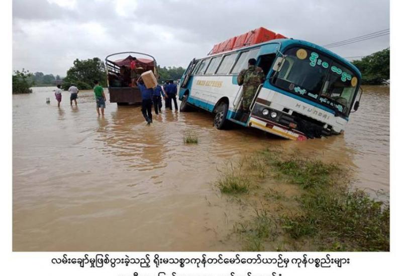 ရခိုင်ပြည်နယ်အတွင်း မိုးသည်းထန်စွာ ရွာသွန်းမှုကြောင့် သံတွဲ၊ ဘူးသီတောင်၊ မောင်တောမြို့နယ်များအတွင်း ရေကြီး၊ ရေလျှံမှုများဖြစ်ပေါ်ခဲ့သဖြင့် အနောက်ပိုင်းတိုင်း စစ်ဌာနချုပ်မှ နယ်မြေခံတပ်မတော်သားများ၊ မြန်မာနိုင်ငံရဲတပ်ဖွဲ့ဝင်များ၊ မီးသတ်တပ်ဖွဲ့ ဝင်များနှင့် ဌာနဆိုင်ရာတာဝန်ရှိသူများက ရေဘေးသင့်ပြည်သူများအား ကူညီကယ်ဆယ် ရေးလုပ်ငန်းများ စုပေါင်းဆောင်ရွက်ပေးလျက်ရှိသည်။
