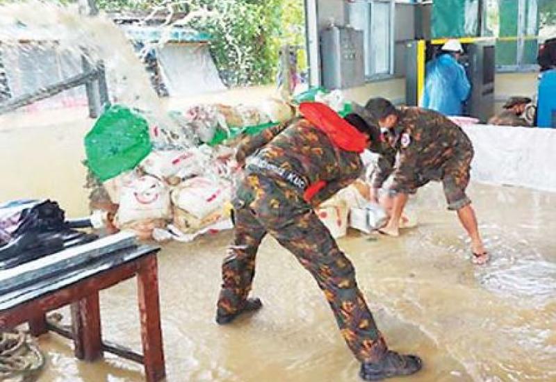 ရခိုင်ပြည်နယ်၊ သံတွဲမြို့နယ်အတွင်း ဇူလိုင် ၂၆ ရက်မှစ၍ မိုးသည်းထန်စွာ ရွာသွန်းပြီး ရခိုင်ရိုးမပေါ်မှ တောင်ကျရေများ ကျဆင်းလာမှုကြောင့် သံတွဲချောင်းရေသည် ၇၀၅ စင်တီမီတာအထိ မြင့်တက်ခဲ့ရာ စိုးရိမ်ရေအမှတ်ထက် ၅၅ စင်တီမီတာ ကျော်လွန်ခဲ့သဖြင့် အဆိုပါမြို့ရှိ အမှတ်(၁)ရပ်ကွက်၊ အမှတ်(၄)ရပ်ကွက်၊ အမှတ်(၇) ရပ်ကွက်နှင့် အံတော်ကျေးရွာများတွင် ရေကျော်ဝင်ရောက်မှုများ ဖြစ်ပေါ် လျက်ရှိရာ အနောက်ပိုင်းတိုင်းစစ်ဌာနချုပ်မှ နယ်မြေခံတပ်မတော်သားများက ရေဘေးလွတ်ရာနေရာ များသို့ ရွှေ့ပြောင်းနေထိုင်နိုင်ရေး လိုအပ်သည့် ကူညီကယ်ဆယ်ရေးလုပ်ငန်းများ သွားရောက် ဆောင်ရွက်ပေးသည်။