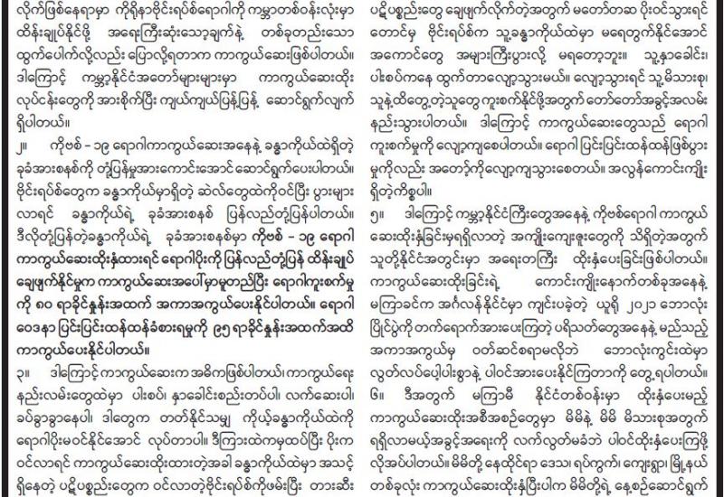 နိုင်ငံတော်အတွင်း ကိုဗစ်-၁၉ ကာကွယ်၊ ထိန်းချုပ်၊ ကုသရေးလုပ်ငန်းများအတွက် အရေးတကြီး လိုအပ်လျက်ရှိသည့် အောက်စီဂျင်အရည်၊ အောက်ဆီဂျင်ဓာတ်ငွေ့၊ အိမ်သုံးအောက်ဆီဂျင် စက်နှင့် ဆေးဝါးနှင့်ဆက်စပ်ပစ္စည်းများ အများပြည်သူရုံးပိတ်ရက်များတွင် ပြတ်လပ်မှုမရှိစေရန် ရန်ကုန် အပြည်ပြည်ဆိုင်ရာလေဆိပ်၊ ပင်လယ်ရေကြောင်းဆိပ်ကမ်းများနှင့်် နယ်စပ်ကုန်သွယ်ရေးစခန်းများ ဖြစ်သည့် တရုတ်နိုင်ငံဘက်မျက်နှာစာမှ မူဆယ်၊ ချင်းရွှေဟော်၊ ကန်ပိုက်တီး၊ လွယ်ဂျယ် နှင့် ထိုင်း နိုင်ငံဘက် မျက်နှာစာမှ မြဝတီ၊ တာချီလိတ်၊ ကော့သောင်း၊ မောတောင်၊ ထီးခီးတို့မှ အဆက်မပြတ် တင်သွင်းခွင့်ပြုလျက်ရှိပါသည်။