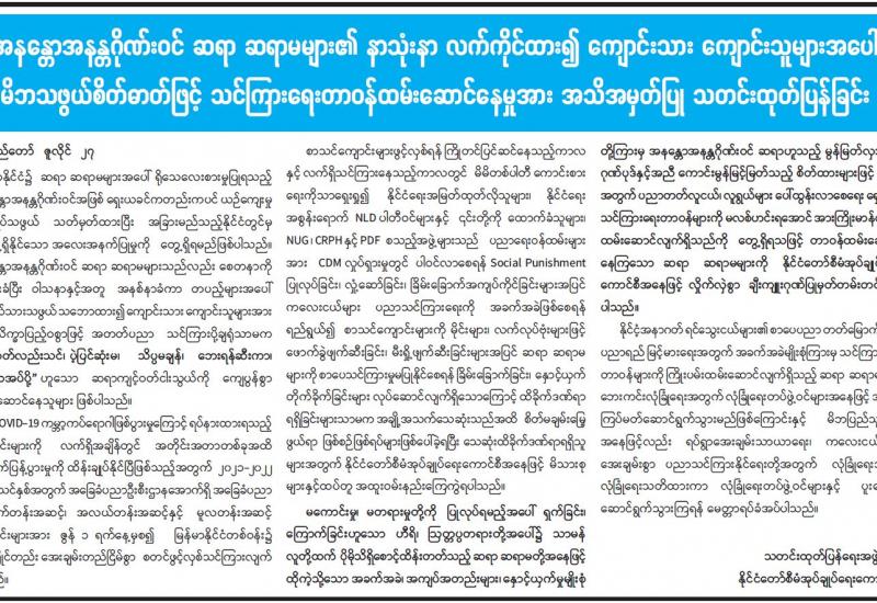 နိုင်ငံတော်စီမံအုပ်ချုပ်ရေးကောင်စီ၏ လမ်းညွန်မှုဖြင့် ကျန်းမာရေးနှင့်အားကစားဝန်ကြီးဌာန၊ ပြည်သူ့ကျန်းမာရေးနှင့်ကုသရေးဦးစီးဌာန က တရုတ်ပြည်သူ့သမ္မတနိုင်ငံမှ ရောက်ရှိလာသည့် ကိုဗစ်-၁၉ ရောဂါကာကွယ်ဆေး (၃)သန်းအား နေပြည်တော်ကောင်စီနယ်မြေ၊ တိုင်းဒေသကြီးနှင့် ပြည်နယ်အသီးသီးသို့ ဦးတည်အုပ်စုလူဦးရေနှင့် ဦးစားပေးအစီအစဉ်များနှင့်အညီ ပြည်သူများကို အမြန်ဆုံးထိုးနှံပေးနိုင်ရေးအတွက် သတ်မှတ်အအေးလမ်းကြောင်းစံချိန်စံညွန်းများအတိုင်း အချိန် နှင့်တစ်ပြေးညီ ဖြန့်ဖြူးပေးလျက်ရှိသည်။