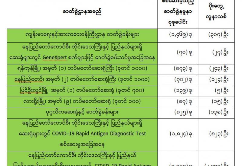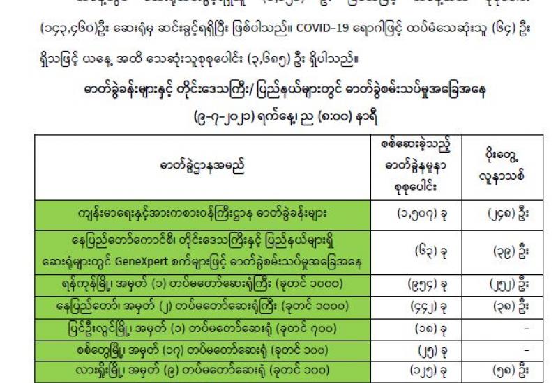 (၈-၇-၂၀၂၁) ရက်နေ့၊ ည (၈:၀၀) နာရီမှ (၉-၇-၂၀၂၁) ရက်နေ့၊ ည (၈:၀၀) နာရီအတွင်း ဓာတ်ခွဲနမူနာစုစုပေါင်း (၁၅,၇၄၇) ခုအား စစ်ဆေးပြီးစီးခဲ့ရာ COVID-19 ရောဂါ ဓာတ်ခွဲအတည်ပြု လူနာသစ် (၄,၃၂၀) ဦး တွေ့ရှိရပါသည်။သို့ဖြစ်ပါ၍ ယနေ့အထိ ဓာတ်ခွဲနမူနာစုစုပေါင်း (၂,၈၄၁,၅၆၉)ခု အား စစ်ဆေးခဲ့ပြီး COVID-19 ဓာတ်ခွဲအတည်ပြုလူနာ စုစုပေါင်း (၁၈၄,၃၇၅) ဦး ရှိပြီ ဖြစ်ပါသည်။