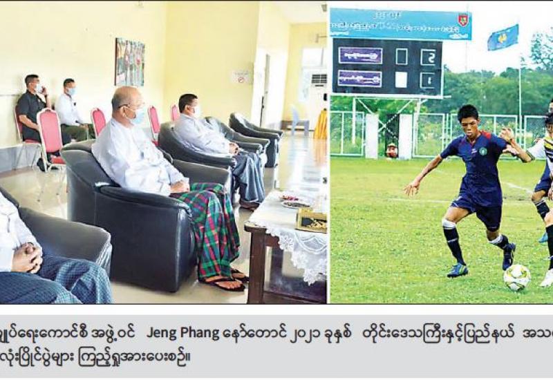 ကျန်းမာရေးနှင့် အားကစားဝန်ကြီးဌာန၊ အားကစားနှင့် ကာယပညာဦးစီးဌာနနှင့် မြန်မာနိုင်ငံ ဘောလုံးအဖွဲ့ချုပ်တို့ ပူးပေါင်းကျင်းပသော ၂၀၂၁ ခုနှစ် တိုင်းဒေသကြီးနှင့်ပြည်နယ် အသက် ၂၁ နှစ်အောက်(အမျိုးသား) ဘောလုံးပြိုင်ပွဲများကို နေပြည်တော်ရှိ ဝဏ္ဏသိဒ္ဓိအားကစား လေ့ကျင့်ရေးကွင်းများ၌ ကျင်းပရာ နိုင်ငံတော်စီမံ အုပ်ချုပ်ရေးကောင်စီ အဖွဲ့ဝင် Jeng Phang နော်တောင်နှင့် ကျန်းမာရေးနှင့်အားကစား ဝန်ကြီးဌာန ဒုတိယဝန်ကြီး ဦးမျိုးလှိုင်တို့ တက်ရောက်ကြည့်ရှုအားပေး ကြသည်။