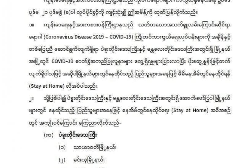 ကိုဗစ်-၁၉ ရောဂါဗစ်-၁၉ ရောဂါကူးစက်နေသည်ကို သတိပြုယခုအခါတွင် ကိုဗစ်-၁၉ ရောဂါ ကူးစက်ပြန့်ပွားမှုမှာ ကမ္ဘာနှင့်တစ်ဝန်း မြင့်မား လာနေပြီး မြန်မာနိုင်ငံတွင်လည်း ကိုဗစ်-၁၉ ရောဂါကူးစက်မှုသည် တစ်နေ့ထက်တစ်နေ့ တိုးတက်ဖြစ်ပေါ်နေရာ ရောဂါကူးစက် ပြန့်ပွားမှုရှိနေသည်ကို သတိပြုရမည်ဖြစ်သည်။ ကိုဗစ်-၁၉ ရောဂါ ကူးစက်ပြန့်ပွားမှု မြင့်မားနေသော မြို့နယ်များ အား နေအိမ်တွင်နေထိုင်ရေး (Stay at Home) အစီအစဉ်များကို ကျန်းမာရေးနှင့် အားကစားဝန်ကြီးဌာနက ထုတ်ပြန်ထားသော အမိန့်၊ ညွှန်ကြားချက်၊ လုပ်ငန်းစဉ် များနှင့်အညီ ပြည်သူများအနေဖြင့် အတိအကျလိုက်နာဆောင်ရွက်ကြရန် လိုအပ် ပေသည်။