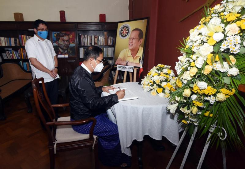 နိုင်ငံခြားရေးဝန်ကြီးဌာန မဟာဗျူဟာလေ့လာရေးနှင့် လေ့ကျင့်ရေးဦးစီးဌာန ညွှန်ကြားရေး မှူးချုပ် ဦးအောင်မြင့်သည် ၂၀၂၁ ခုနှစ် ဇွန် ၂၄ ရက်တွင် ကွယ်လွန်သွားသည့် ဖိလစ်ပိုင်နိုင်ငံ၏ သမ္မတ ဟောင်းဖြစ်သူ H.E. Benigno S. Aquino III အတွက် ရန်ကုန်မြို့ ဗဟန်းမြို့နယ် အမှတ် (၂၁) ဖိုးစိန်လမ်းရှိ မြန်မာနိုင်ငံဆိုင်ရာ ဖိလစ်ပိုင်သံရုံး၌ ဖွင့်လှစ်ထားရှိ သော ဝမ်းနည်းခြင်း အထိမ်းအမှတ်စာအုပ်၌ ယနေ့ မွန်းလွဲ ၃ နာရီခွဲတွင် သွားရောက် လက်မှတ်ရေးထိုးသည်။