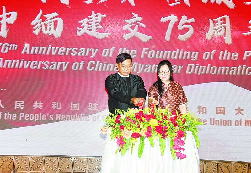 တရုတ်ပြည်သူ့သမ္မတနိုင်ငံ တည်ထောင်သည့် (၇၆) နှစ်မြောက် နှစ်ပတ်လည်နှင့် မြန်မာ- တရုတ် သံတမန်ဆက်ဆံရေး (၇၅) နှစ်ပြည့် အထိမ်းအမှတ်ဧည့်ခံပွဲအခမ်းအနားကို ယနေ့ ညနေပိုင်းတွင် ရန်ကုန်မြို့ မင်္ဂလာတောင်ညွန့်မြို့နယ်ရှိ WYNDHAM GRAND Yangon Hotel ၌ ကျင်းပရာ နိုင်ငံတော်သမ္မတရုံးဝန်ကြီးဌာန (၁) ပြည်ထောင်စုဝန်ကြီး ဦးတင်အောင်စန်းနှင့် ဇနီးတို့ တက်ရောက်ကြသည်။