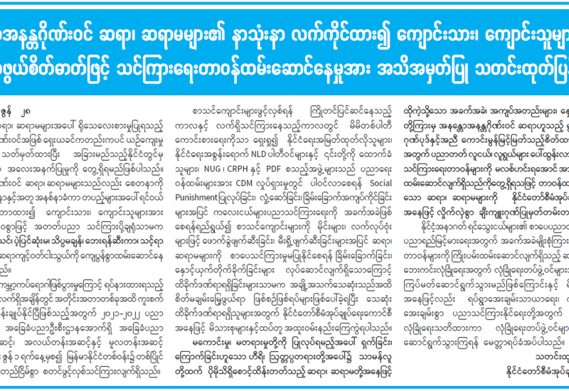 ပြည်သူလူထုအတွက် အဓိကအကျဆုံးဖြစ်သော ကျန်းမာရေးကဏ္ဍ မြင့်မားရေးအတွက် တပ်မတော်မှ ပါရဂူများ၊ ဆေးမှူးများ၊ သူနာပြုများဖြင့် ဝိုင်းဝန်းကူညီဆောင်ရွက် ပေးလျက်ရှိသည့်အပြင် ပြည်သူလူထု၏ အရေးပေါ် ကျန်းမာရေးဆိုင်ရာကုသမှုများ ဆောင်ရွက်ပေးနိုင်ရန် အတွက် တပ်မတော်ဆေးရုံများနှင့် ယာယီကုသရေးဆေးရုံများ၌ ကျန်းမာရေးစောင့်ရှောက်မှုများကို နေ့ညမပြတ် ဆောင်ရွက်ပေး လျက်ရှိရာ ဖေဖော်ဝါရီ ၅ ရက်မှ ယနေ့အထိ ပြင်ပလူနာပေါင်း ၂၅၉၅၇၅ ဦးနှင့် အတွင်းလူနာပေါင်း ၇၅၇၉၄ ဦးတို့ကို ကုသပေးနိုင်ခဲ့သည်။