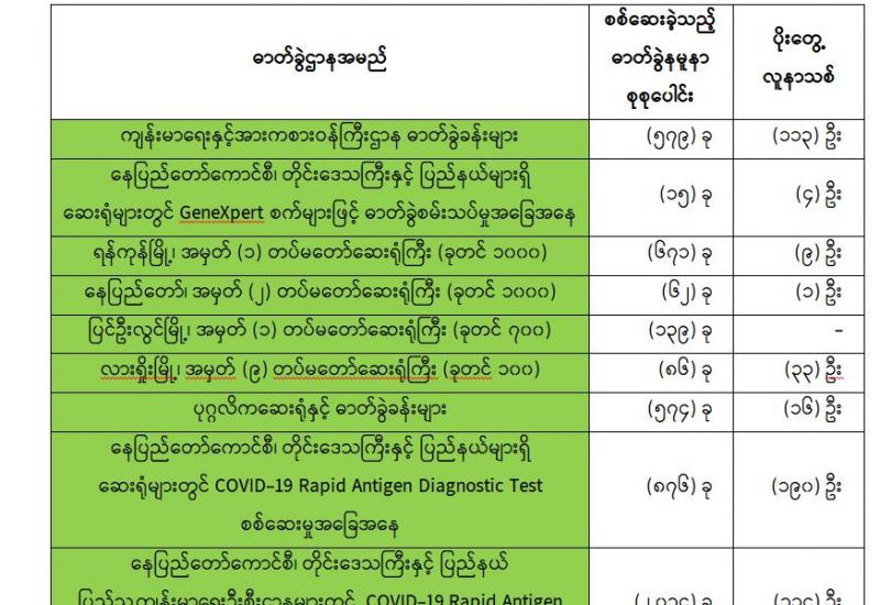 (၂၂-၆-၂၀၂၁) ရက်နေ့၊ ည (၈:၀၀) နာရီမှ (၂၃-၆-၂၀၂၁) ရက်နေ့၊ ည (၈:၀၀) နာရီအတွင်း ဓာတ်ခွဲနမူနာ စုစုပေါင်း (၅,၀၃၆)ခုအား စစ်ဆေးပြီးစီးခဲ့ရာ COVID-19 ရောဂါ ဓာတ်ခွဲအတည်ပြု လူနာသစ် (၆၈၀) ဦး တွေ့ရှိရပါသည်။ သို့ဖြစ်ပါ၍ ယနေ့အထိ ဓာတ်ခွဲနမူနာ စုစုပေါင်း (၂,၆၈၉,၇၉၂) ခု အား စစ်ဆေးခဲ့ပြီး COVID-19 ဓာတ်ခွဲအတည်ပြုလူနာ စုစုပေါင်း (၁၄၉,၉၂၇) ဦး ရှိပြီ ဖြစ်ပါသည်။