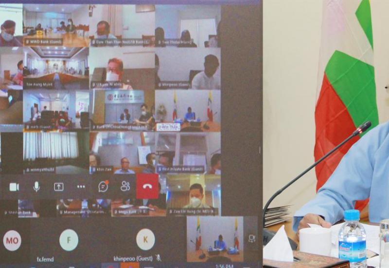 မြန်မာနိုင်ငံတော်ဗဟိုဘဏ်၊ ဒုတိယဥက္ကဋ္ဌ ဦးဝင်းသော်သည် နိုင်ငံခြားသုံးငွေ စီမံခန့်ခွဲမှုဌာန၊ ညွှန်ကြားရေးမှူးချုပ်နှင့် အရာထမ်းများ၊ နိုင်ငံခြားသုံးငွေများ ရောင်းဝယ်ဖောက်ကားသည့် လုပ်ငန်း (AD) လိုင်စင်ရဘဏ် (၄၃)ဘဏ်မှ တာဝန်ရှိသူများနှင့် ယနေ့မွန်းလွဲ ၂ နာရီတွင် ဗီဒီယိုကွန်ဖရင့် ဖြင့် အစည်းအဝေးပြုလုပ်သည်။