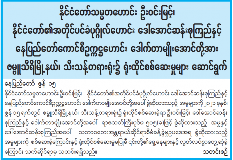 ပြန်ကြားရေးဝန်ကြီးဌာနသည် ပြည်ထောင်စုအစိုးရ၏ သဘောတူညီချက်ဖြင့် ပုံနှိပ်ခြင်းနှင့် ထုတ်ဝေခြင်းလုပ်ငန်းနည်းဥပဒေများကို အမိန့်ကြော်ငြာစာအမှတ် (၄၈/၂၀၁၄)ဖြင့် ၂၀၁၄ ခုနှစ်၊ အောက်တိုဘာလ (၁၀)ရက်နေ့တွင် ထုတ်ပြန်ခဲ့ပြီးနောက် လုပ်ငန်းအသိအမှတ်ပြုလက်မှတ် လျှောက်ထားလာပါက ပုံနှိပ်ခြင်းနှင့်ထုတ်ဝေခြင်းလုပ်ငန်း နည်းဥပဒေများနှင့်အညီစိစစ်၍ လုပ်ငန်း အသိအမှတ်ပြုလက်မှတ်များကို ခွင့်ပြုပေးလျက်ရှိပါသည်။