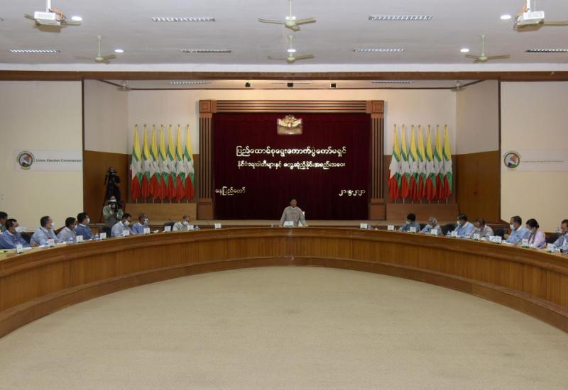 ပြည်ထောင်စုရွေးကောက်ပွဲကော်မရှင်နှင့် နိုင်ငံရေးပါတီများ တွေ့ဆုံညှိနှိုင်းအစည်းအဝေးကို ယနေ့ နံနက် ၉ နာရီတွင် နေပြည်တော်ရှိ ပြည်ထောင်စုရွေးကောက်ပွဲကော်မရှင်ရုံး အစည်းအဝေးခန်းမ၌ ကျင်းပပြုလုပ်ရာ ပြည်ထောင်စုရွေးကောက်ပွဲကော်မရှင်ဥက္ကဋ္ဌ ဦးသိန်းစိုးနှင့် ကော်မရှင်အဖွဲ့ဝင်များ၊ ကော်မရှင်ရုံးမှ တာဝန်ရှိသူများနှင့် နိုင်ငံရေးပါတီ ၅၉ ပါတီမှ တာဝန်ရှိသူများတက်ရောက်ကြသည်။