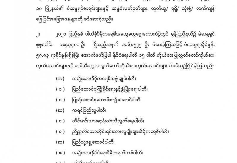 တိုင်းဒေသကြီး/ပြည်နယ်များရှိ မြို့နယ်အချို့၌ အေးချမ်းစွာ နေထိုင်လိုသည့် ပြည်သူလူထုများမှ ၎င်းတို့၏သဘောဆန္ဒအလျောက် ၎င်းတို့ ထံတွင်ရှိသော လက်လုပ်သေနတ်များအား အုပ်ချုပ်ရေးတာဝန်ရှိသူ များမှတစ်ဆင့် လုံခြုံရေးတပ်ဖွဲ့ဝင်များထံ လာရောက်အပ်နှံလျက် ရှိသည်။