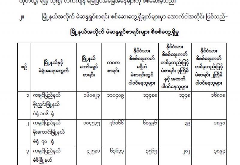 တိုင်းဒေသကြီးနှင့် ပြည်နယ်များရှိ တိုင်းရင်းသား ပြည်သူများအတွက် တပ်မတော်ဆေးရုံများနှင့် ယာယီကုသရေးဆေးရုံများတွင် ကျန်းမာရေး စောင့်ရှောက်မှုများကို ဆောင်ရွက်ပေးလျက်ရှိရာ ဖေဖော်ဝါရီ ၅ ရက်မှ ယနေ့အထိ ပြင်ပလူနာ ၁၆၂၈၀၇ ဦး၊ အတွင်းလူနာ ၄၁၉၁ ဦးကို ကုသ ပေးနိုင်ခဲ့ပြီး ၎င်းလူနာများအနက် အကြီးစားခွဲစိတ် ကုသရန်လိုအပ်သူ ၇၆၃၅ ဦး၊ အသေးစားခွဲစိတ် ကုသရန်လိုအပ်သူ ၃၉၀၁ ဦး စုစုပေါင်း ၁၁၅၃၆ ဦးတို့ကို ခွဲစိတ်ကုသပေးနိုင်ခဲ့သည့်အပြင် စိုးရိမ် ဖွယ်ရာရှိသည့် လူနာများကိုလည်း ပါရဂူများ၊ ဆေးမှူးများဖြင့် အထူးကြပ်မတ်ကုသပေးလျက်ရှိ သည်။ ထို့အပြင် ကလေးမီးဖွားလူနာ ၃၉၆၈ ဦးကို ခွဲစိတ်မွေးဖွားပေးနိုင်ခဲ့ကာ ၆၁၅၀ ကို သာမန် မွေးဖွားပေးနိုင်ခဲ့ခြင်းကြောင့် ယနေ့အထိ ကလေး ငယ် ၁၀၁၁၈ ဦးကို အောင်မြင်စွာ မွေးဖွားပေးနိုင်ခဲ့သည်။
