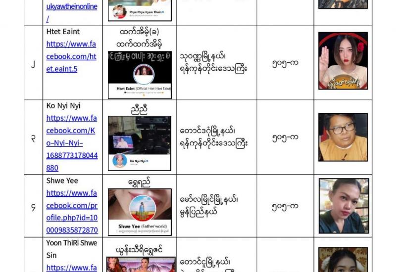 နိုင်ငံတော်၏ အုပ်ချုပ်မှုယန္တရားပျက်ပြားစေရန်ရည်ရွက်ချက်ဖြင့် နိုင်ငံ့ဝန်ထမ်းများအား CDM လှုပ်ရှား မှုတွင် ပါဝင်စေရန်လှုံ့ဆော်ခြင်း၊ CRPH မတရားအသင်းအား ထောက်ခံသည့် အကြောင်းအရာများ၊ မမှန်သတင်းများအားဖြန့်ဝေခြင်း၊ နိုင်ငံတော်တည်ငြိမ်အေးချမ်းမှုကို ပျက်ပြားစေပြီး ဆူပူအုံကြွမှု ဖြစ်ပေါ်စေရန်နှင့် အများပြည်သူအထိတ်တလန့်ဖြစ်စေရန် အတွက် သွေးထိုးလှုံ့ဆော်မှုများ ပြုလုပ်ခြင်း၊ Social Pumishment ပြုလုပ်ခြင်းများကို လူမှုကွန်ရက် စာမျက်နှာများတွင် ရည်ရွယ်ချက်ရှိရှိ ဖြင့်ဖော်ပြခြင်းနှင့် ဖြန့်ဝေခြင်းများ ဆောင်ရွက် လျက်ရှိသည့် အောက်ဖော်ပြပါ အနုပညာရှင်အချို့နှင့် အခြားပါဝင်ပတ်သက်သူများအား ရာဇသတ်ကြီးပုဒ်မ ၅၀၅-က ဖြင့် အမှုဖွင့်အရေးယူ ဆောင်ရွက် လျက်ရှိပါသည်။