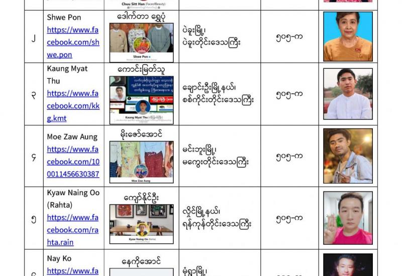 နိုင်ငံတော်၏ အုပ်ချုပ်မှုယန္တရားပျက်ပြားစေရန်ရည်ရွက်ချက်ဖြင့် နိုင်ငံ့ဝန်ထမ်းများအား CDM လှုပ်ရှားမှုတွင် ပါဝင်စေရန်လှုံ့ဆော်ခြင်း၊ CRPH မတရားအသင်းအား ထောက်ခံသည့် အကြောင်းအရာများ၊ မမှန်သတင်းများအားဖြန့်ဝေခြင်း၊ နိုင်ငံတော်တည်ငြိမ်အေးချမ်းမှုကို ပျက်ပြားစေပြီး ဆူပူအုံကြွမှုဖြစ်ပေါ်စေရန်နှင့် အများပြည်သူအထိတ်တလန့်ဖြစ်စေရန် အတွက် သွေးထိုးလှုံ့ဆော်မှုများပြုလုပ်ခြင်း၊ Social Punishment ပြုလုပ်ခြင်းများကို လူမှုကွန်ရက် စာမျက်နှာများတွင် ရည်ရွယ်ချက်ရှိရှိ ဖြင့်ဖော်ပြခြင်းနှင့် ဖြန့်ဝေခြင်းများ ဆောင်ရွက် လျက်ရှိသည့် အောက်ဖော်ပြပါ အနုပညာရှင်အချို့နှင့် အခြားပါဝင်ပတ်သက်သူများအား ရာဇသတ်ကြီးပုဒ်မ ၅၀၅-က ဖြင့် အမှုဖွင့်အရေးယူ ဆောင်ရွက်လျက်ရှိပါသည်။