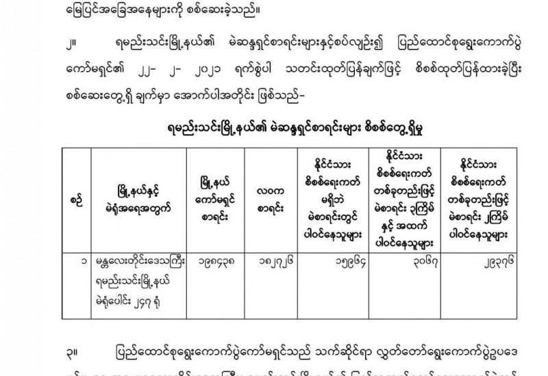 ၁၀။ ပြည်ထောင်စုရွေးကောက်ပွဲကော်မရှင် အဖွဲ့ဝင် ဦးခင်မောင်ဦးက ဆက်လက်ရှင်းလင်းရာ တွင် ၂၀၂၀ ပြည့်နှစ်အထွေထွေရွေးကောက်ပွဲတွင် သက်ဆိုင်ရာ မြို့နယ်ကော်မရှင်အဖွဲ့ခွဲများ အသုံး ပြုခဲ့သည့် နောက်ဆုံး မဲစာရင်း soft copy များကို ရယူပြီးနောက် ပြည်ထောင်စုရွေးကောက်ပွဲကော် မရှင်က စိစစ်ထုတ်ပြန်လျက်ရှိရာ ၂၀၂၁ ခုနှစ်၊ ဖေဖော်ဝါရီလ ၁၆ ရက်နေ့မှ ဧပြီလ ၈ ရက်နေ့အထိ ထုတ်ပြန်ပြီးစီးမှုများအရ တိုင်းဒေသကြီး/ပြည်နယ် နှင့် ပြည်ထောင်စုနယ်မြေ ၁၁ ခုရှိ မြို့နယ်ပေါင်း ၁၀၆ မြို့ နယ်၊ မဲရုံပေါင်း ၁၄၂၁၄ ရုံကို စိစစ်ခဲ့ရာ မြို့နယ်ကော်မရှင် စာရင်းအရ မဲဆန္ဒရှင် ၁၄၄၈၅၃၃၀ ဦးဖြစ်သော်လည်း လဝကစာရင်းအရ ၁၁၁၁၁၈၁၆ ဦးသာရှိပြီး ၃၃၇၃၅၁၄ ဦးကွာခြားမှု ရှိကြောင်း၊ ၎င်းတို့အနက်နိုင်ငံသားစိစစ်ရေးကတ်မရှိဘဲ မဲစာရင်းတွင် ပါဝင်နေသူ ၁၅၅၄၁၅၇ ဦး နိုင်ငံသားစိစစ်ရေး ကတ်တစ်ခုတည်းဖြင့် မဲစာရင်း ၃ ကြိမ်နှင့်အထက်ပါဝင်နေသူ ၁၁၁၂၃၉ ဦး နိုင်ငံသားစိစစ်ရေးကတ် တစ်ခုတည်းဖြင့် မဲစာရင်း ၂ ကြိမ်ပါဝင်သူ ၁၁၁၈၇၈၇ ဦး၊ စိစစ်ရေးကတ်မရှိဘဲ မဲစာရင်းတွင် ပါဝင်နေသူနှင့် မဲစာရင်းထပ်နေသူ စုစုပေါင်း ၂၇၈၄၁၈၃ ဦးရှိသည်ကို တွေ့ရှိရပြီး ရာခိုင်နှုန်းအားဖြင့် မဲဆန္ဒရှင်၏ ၁၉ ဒသမ ၂ ရာခိုင်နှုန်းဖြစ်ကြောင်း၊ ယခုစစ်ဆေးထုတ်ပြန်မှုများ သည် မြို့နယ်တစ်ခုချင်းအလိုက် စိစစ်တွေ့ရှိမှုများ သာဖြစ်ပြီး အခြားတိုင်းဒေသကြီး/ ခရိုင်/မြို့နယ် များနှင့် တိုက်ဆိုင်စစ်ဆေးမှု (Cross Check) များ ပါဝင်ပါက တပ်မတော်သတင်းမှန် ပြန်ကြားရေးအဖွဲ့ က မြို့နယ် ၃၁၅ မြို့နယ်၏ မဲစာရင်း CD PDF များကို အခြေခံထုတ်ပြန်ခဲ့သည့် မဲမသမာမှု ပြုနိုင်/ ဖြစ်နိုင်သည့် အရေအတွက် ၁၀၄၈၂၁၁၆ ဦး ရာခိုင် နှုန်း ၂၈ ဒသမ ၁၇ ရာခိုင်နှုန်းထက် ပိုမိုများပြားနိုင် သည်ကို စိစစ်တွေ့ရှိရပါကြောင်း ဖော်ပြပါ မြို့နယ် ၁၀၆ မြို့နယ်၏ မဲဆန္ဒရှင်စာရင်းများအပေါ် တပ်မတော် စိစစ်ချက်များနှင့် ပြည်ထောင်စုရွေးကောက်ပွဲကော်မရှင်၏ စိစစ် တွေ့ရှိချက်များကို နှိုင်းယှဉ်ရာတွင်လည်း စိစစ်သည့် အခြေခံမဲဆန္ဒရှင် စာရင်း ကွာခြားချက်အရ ကော်မရှင်၏ စိစစ်တွေ့ရှိ မှု အရေအတွက်ကကိုင်ဆောင်လက်မှတ်တစ်မျိုးမျိုး (မှတ်ပုံတင်) မရှိဘဲ မဲစာရင်းတွင် ပါဝင်နေသူ ၆၃၉၂၇ ဦး၊ တစ်ကြိမ်ထက်ပို၍ မဲစာရင်းတွင် ပါဝင် သူ (ထပ်နေသော မဲစာရင်း) ၃၅၈၀၁၈ ဦး ပိုမို စိစစ်တွေ့ရှိရပါကြောင်း၊ ယခုဆက်လက်ပြီး ၂ဝ၂ဝ ပြည့်နှစ် အထွေထွေရွေးကောက်ပွဲတွင် အသုံးပြုခဲ့သည့် ဆန္ဒမဲလက်မှတ်များကို မြေပြင်ကွင်းဆင်းစစ်ဆေးပြီး ထုတ်ပြန်လျက်ရှိမှု အခြေ အနေများကို တင်ပြမှာဖြစ်ပါကြောင်း၊ ပြည်ထော င်စုရွေးကောက်ပွဲကော်မရှင် အနေဖြင့် ၂၀၂၁ ခုနှစ်၊ ဖေဖော်ဝါရီလ ၂၄ ရက်နေ့မှ