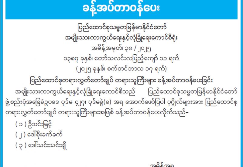 ပြည်ထောင်စုတရားလွှတ်တော်ချုပ် တရားသူကြီးများ ခန့်အပ်တာဝန်ပေးခြင်း