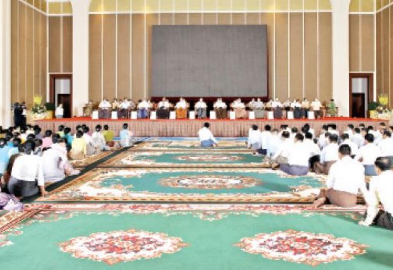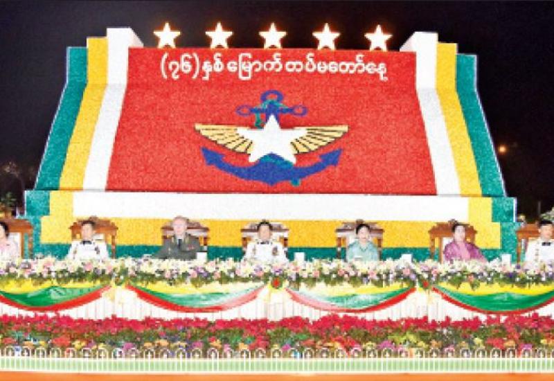 ၂၀၂၁ ခုနှစ်၊ (၇၆)နှစ်မြောက် တပ်မတော်နေ့ အထိမ်းအမှတ်ဧည့်ခံပွဲနှင့် ဂုဏ်ပြု ညစာစားပွဲအခမ်းအနားကို ယနေ့ညပိုင်းတွင် နေပြည်တော်ရှိ ဇေယျာသီရိဗိမာန် ဥပစာ ရင်ပြင်၌ ကျင်းပပြုလုပ်ရာ နိုင်ငံတော်စီမံအုပ်ချုပ်ရေးကောင်စီဥက္ကဋ္ဌ တပ်မတော် ကာကွယ်ရေးဦးစီးချုပ် ဗိုလ်ချုပ်မှူးကြီး မင်းအောင်လှိုင်နှင့် ဇနီး ဒေါ်ကြူကြူလှ တို့ တက်ရောက်ကြသည်။
