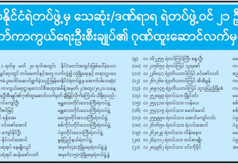 မန္တလေးတိုင်းဒေသကြီး မိတ္ထီလာခရိုင် သာစည် မြို့နယ်ဆေးရုံ၊ ဟံဇားတိုက်နယ်ဆေးရုံ၊ ယင်းမာပင် တိုက်နယ်ဆေးရုံ၊ ညောင်ရမ်းတိုက်နယ်ဆေးရုံ၊ သပိတ်ကျင်းမြို့နယ် တကောင်းတိုက်နယ်ဆေးရုံ၊ ကျောက်ဆည်မြို့နယ် စဉ့်ကိုင်ပြည်သူ့ဆေးရုံ၊ ပျော်ဘွယ်မြို့နယ် ယင်းတော်တိုက်နယ်ဆေးရုံ၊ ဝမ်းတွင်းမြို့နယ် ပင်းတလဲတိုက်နယ်ဆေးရုံ၊ မြစ်သားမြို့နယ် ပြည်သူ့ဆေးရုံ၊ တောင်သာမြို့နယ် ဝဲလောင်တိုက်နယ်ဆေးရုံ၊ ကျောက်ပန်းတောင်း မြို့နယ် ပြည်သူ့ဆေးရုံ၊ ပဲခူးတိုင်းဒေသကြီး ကျောက် တံခါးမြို့နယ် ပြည်သူ့ဆေးရုံ၊ ရွှေကျင်မြို့နယ် ဒုံဇရစ်ကျေးရွာ တိုက်နယ်ဆေးရုံနှင့် လက်ပံတန်း မြို့နယ် ပြည်သူ့ဆေးရုံတို့ရှိ ဝန်ထမ်းများနှင့် လူနာရှင်များက အကူအညီတောင်းခံမှုကြောင့် တပ်မတော်မှ ဆေးကုသရေးအဖွဲ့များစေလွှတ်၍ ရောဂါဝေဒနာခံစားနေရသည့် ဒေသခံပြည်သူများကို လိုအပ်သည့် ကျန်းမာရေးစောင့်ရှောက်မှုလုပ်ငန်းများ ဆောင်ရွက်ပေးလျက်ရှိရာ ယနေ့တွင်လည်း ခွဲစိတ် ကုသမှုဆိုင်ရာရောဂါ၊ သွားနှင့် ခံတွင်းရောဂါ၊ အရိုး | အကြောရောဂါ၊ အစာအိမ်ရောဂါ၊ မျက်စိရောဂါ၊ နား၊ နှာခေါင်း၊ လည်ချောင်းရောဂါ၊ သားဖွားမီးယပ်ရောဂါ၊ ၊ သွေးတိုးရောဂါ၊ နှလုံးရောဂါ၊ အထွေထွေရောဂါတို့ နှင့်ပတ်သက်၍ လိုအပ်သည့် ကျန်းမာရေးစစ်ဆေး ကုသပေးခြင်းများကို ဆက်လက်ဆောင်ရွက်ပေးပြီး ခွဲစိတ်ကုသရန် လိုအပ်သောလူနာများကို ခွဲစိတ် ကုသပေးခြင်းများ ဆောင်ရွက်ပေးခဲ့သည်။