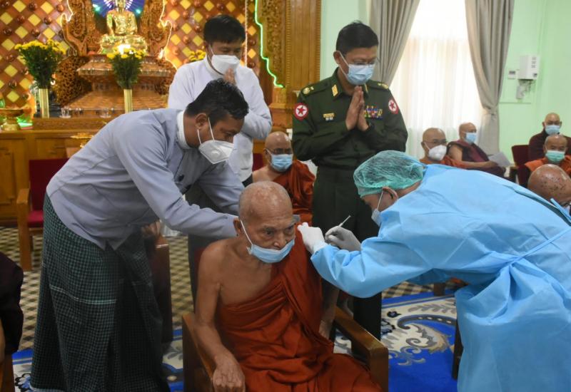 နိုင်ငံတော်သံဃမဟာနာယကအဖွဲ့ဥက္ကဋ္ဌ ဗန်းမော်ကျောင်းတိုက်ဆရာတော်နှင့် ထေရ်ကြီး ဝါကြီးဆရာတော်ကြီးများအား COVID-19 ရောဂါကာကွယ်ဆေး ဒုတိယအကြိမ် ထိုးနှံပေးခြင်း အစီအစဉ်ကို ယနေ့နံနက်ပိုင်း၌ ရန်ကုန်တိုင်းဒေသကြီး မရမ်းကုန်းမြို့နယ် သိရီမင်္ဂလာ ကမ္ဘာ့အေးကုန်းမြေရှိ နိုင်ငံတော်သံဃမဟာနာယက အဖွဲ့ ဘုရားခန်း၌ ပြုလုပ်သည်။