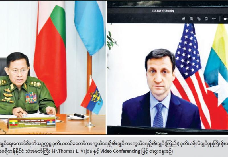နိုင်ငံတော်စီမံအုပ်ချုပ်ရေးကောင်စီ ဒုတိယဥက္ကဋ္ဌ ဒုတိယတပ်မတော် ကာကွယ်ရေးဦးစီးချုပ် ကာကွယ် ရေးဦးစီးချုပ်(ကြည်း) ဒုတိယဗိုလ်ချုပ်မှူးကြီး စိုးဝင်းသည် ပြည်ထောင်စုသမ္မတ မြန်မာနိုင်ငံ ဆိုင်ရာ အမေရိကန်နိုင်ငံ သံအမတ်ကြီး Mr.Thomas L. Vajda အား ယနေ့ နံနက်ပိုင်းတွင် Video Conferencing G¢ 603.28 ဆွေးနွေးသည်။