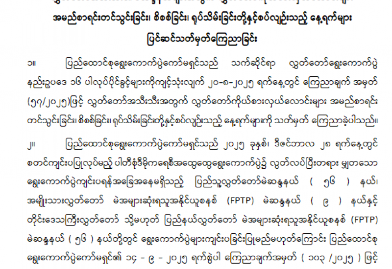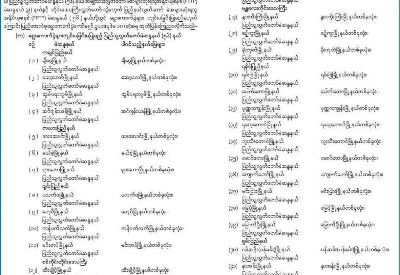 ရွေးကောက်ပွဲများကျင်းပခြင်းမပြုမည့် ပြည်သူ့လွှတ်တော်မဲဆန္ဒနယ်၊ အမျိုးသားလွှတ်တော် မဲအများဆုံးရသူအနိုင်ယူစနစ် (FPTP) မဲဆန္ဒနယ်နှင့် တိုင်းဒေသကြီးလွှတ်တော် သို့မဟုတ် ပြည်နယ်လွှတ်တော် မဲအများဆုံးရသူအနိုင်ယူစနစ် (FPTP) မဲဆန္ဒနယ်များစာရင်း ထုတ်ပြန်ကြေညာ