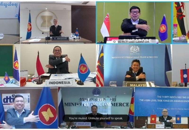 (၃၉) ကြိမ်မြောက် အာဆီယံ စီးပွားရေးပေါင်းစည်းမှုဆိုင်ရာ အဆင့်မြင့်လုပ်ငန်းအဖွဲ့ အစည်းအဝေး (39th Meeting of the High-level Task Force on ASEAN Economic Integration - HLTF-EI ) ကို ယနေ့တွင် ဗီဒီယိုကွန်ဖရင့်စနစ်ဖြင့် ကျင်းပရာ ရင်းနှီးမြှုပ် နှံမှုနှင့် နိုင်ငံခြားစီးပွားဆက်သွယ်ရေးဝန်ကြီးဌာန ဒုတိယဝန်ကြီး ဦးသန်းအောင်ကျော် တက်ရောက် သည်။