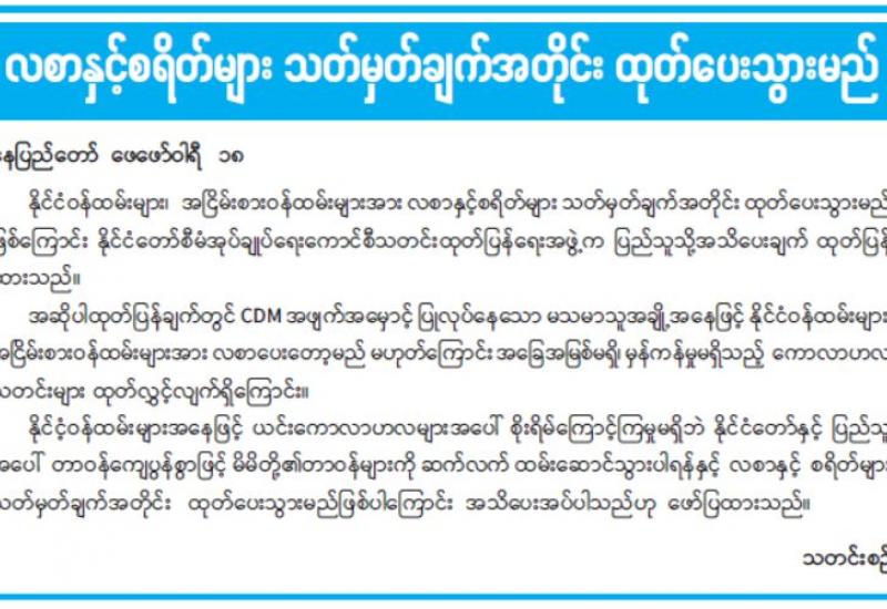 (၂၀၂၁ ခုနှစ်၊ ဖေဖော်ဝါရီလ (၁၈)ရက်နေ့ မွန်းလွဲ (၂:၀၀)နာရီအချိန် ထုတ်ပြန်ချက်)