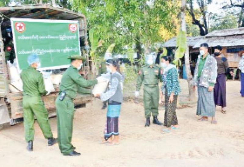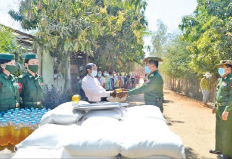 ကိုဗစ်-၁၉ ရောဂါ ကာကွယ်၊ ထိန်းချုပ်၊ ကုသမှုလုပ်ငန်းများ ဆောင်ရွက်နေစဉ်ကာလအတွင်း သွားလာမှုကန့်သတ်ချက်များကြောင့် ဒေသခံပြည်သူများ စားရေးအဆင်ပြေစေရန်အတွက် နယ်မြေခံတပ်မတော်သားများက ဆန်၊ ဆီနှင့် စားသောက်ဖွယ်ရာများကို အိမ်အရောက် လိုက်လံပေးဝေ လှူဒါန်းလျက်ရှိသည်။