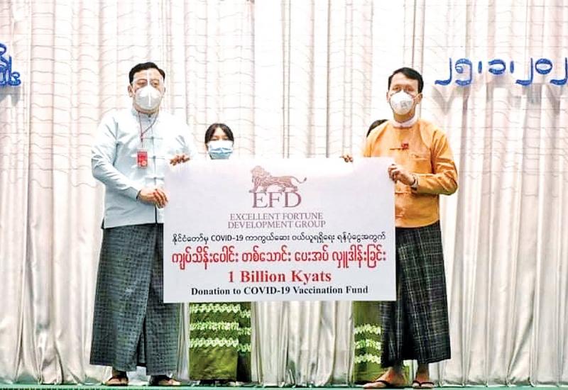 ဦးစိုင်းမျိုးဝင်း(EFD Group) မှ ကိုဗစ်- ၁၉ ကာကွယ်ဆေး ဝယ်ယူရန်အတွက် ကျပ်သိန်းပေါင်း ၁၀၀၀၀ ကို ဇန်နဝါရီ ၂၅ ရက်က ရန်ကုန်မြို့ ဒဂုံမြို့နယ်ရှိ ရန်ကုန်တိုင်းဒေသကြီး အစိုးရအဖွဲ့ရုံး ၌ လှူဒါန်းရာ ရန်ကုန်တိုင်းဒေသကြီး ဝန်ကြီးချုပ် ဦးဖြိုးမင်းသိန်းက လက်ခံသည်။