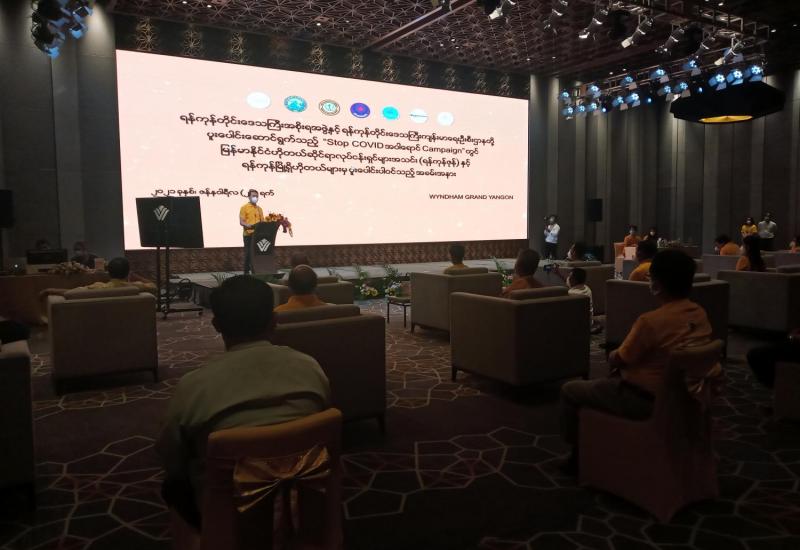 ရန်ကုန်အရှေ့ပိုင်းခရိုင်၊ မင်္ဂလာတောင်ညွန့်မြို့နယ်၊ WYNDHAM GRAND YANGON HOTEL တွင် ယနေ့ နံနက် ၈ နာရီက ကျင်းပပြုလုပ်ခဲ့သည့် ရန်ကုန်တိုင်းဒေသကြီးအစိုးရအဖွဲ့နှင့် ရန်ကုန်တိုင်း ဒေသကြီး ကျန်းမာရေးဦးစီးဌာနတို့ ပူးပေါင်းဆောင်ရွက်သည့် “Stop COVID အဝါရောင် Campaign” တွင် မြန်မာနိုင်ငံ ဟိုတယ်ဆိုင်ရာ လုပ်ငန်းရှင်များအသင်း (ရန်ကုန်ဇုန်) နှင့် ရန်ကုန်မြို့ရှိ ဟိုတယ်များမှ ပူးပေါင်းပါဝင်သည့် အခမ်းအနားသို့ ရန်ကုန်တိုင်းဒေသကြီး အစိုးရအဖွဲ့ ဝန်ကြီးချုပ် ဦးဖြိုးမင်းသိန်းနှင့် အစိုးရအဖွဲ့ဝင် ဝန်ကြီးများနှင့် ရန်ကုန်တိုင်းဒေသကြီး ပြည်သူ့ကျန်းမာရေးနှင့် ကုသရေးဦးစီးဌာနမှူး ဒုတိယညွှန်ကြားရေးမှူးချုပ်နှင့် အဖွဲ့ဝင်များ တက်ရောက်ခဲ့ကြောင်း သိရ သည်။