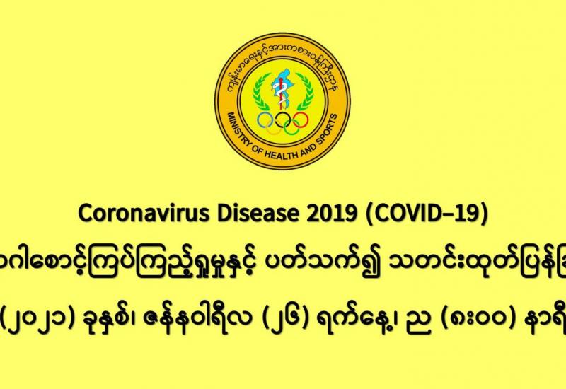 (၂၅-၁-၂၀၂၁) ရက်နေ့၊ ည (၈:၀၀) နာရီမှ (၂၆-၁-၂၀၂၁) ရက်နေ့၊ ည (၈:၀၀) နာရီ အတွင်း ဓာတ်ခွဲနမူနာ စုစုပေါင်း (၁၉,၆၆၇) ခုအားစစ်ဆေးပြီးစီးခဲ့ရာ COVID-19 ရောဂါ ဓာတ်ခွဲ အတည်ပြု လူနာသစ် (၄၁၁) ဦး တွေ့ရှိရပါသည်။