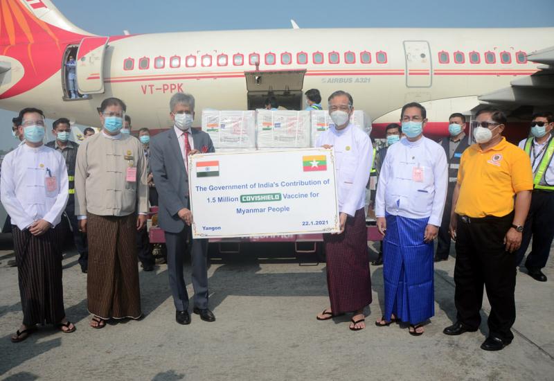 မြန်မာနိုင်ငံက ဆောင်ရွက်လျက်ရှိသည့် ကိုဗစ်-၁၉ ကာကွယ်၊ ထိန်းချုပ်၊ ကုသရေး အစီအမံ များအား အထောက်အကူပြုစေရန် ရည်ရွယ်ပြီး အိန္ဒိယအစိုးရက မြန်မာအစိုးရသို့ အိန္ဒိယ နိုင်ငံအခြေစိုက် Serum Institute of India (SII)ထုတ် ကာကွယ်ဆေး COVIDSHIELD (၁ ဒသမ ၅)သန်းကို ပထမအသုတ်အဖြစ် လှူဒါန်းခဲ့ရာ ယနေ့မွန်းလွဲ ၂ နာရီခွဲတွင် Air India လေယာဉ်ဖြင့် ရန်ကုန်အပြည်ပြည်ဆိုင်ရာလေဆိပ်သို့ ချောမောစွာ ရောက်ရှိသည်။