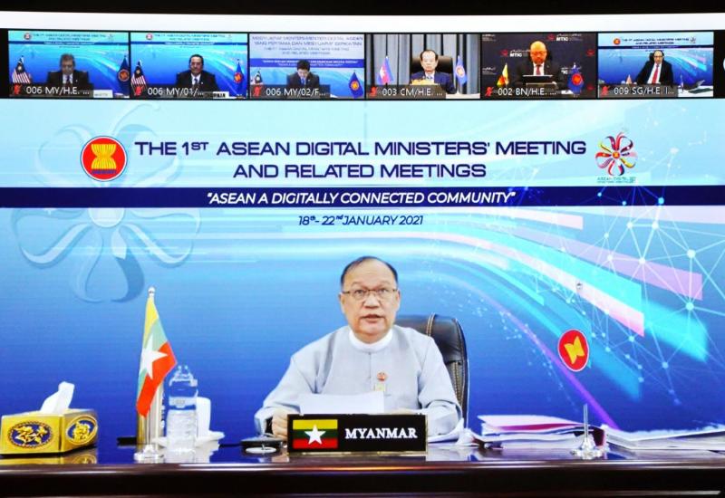 မလေးရှားနိုင်ငံက အလှည့်ကျအိမ်ရှင်အဖြစ် လက်ခံကျင်းပသည့် ပထမအကြိမ် အာဆီယံ ဒီဂျစ်တယ်ဆိုင်ရာ ဝန်ကြီးများအစည်းအဝေးနှင့် ဆက်စပ်အစည်းအဝေးများကို ယနေ့တွင် အွန်လိုင်းစနစ်ဖြင့်ကျင်းပရာ ပို့ဆောင်ရေးနှင့် ဆက်သွယ်ရေးဝန်ကြီးဌာန ပြည်ထောင်စုဝန်ကြီး ဦးသန့်စင်မောင် တက်ရောက်သည်။