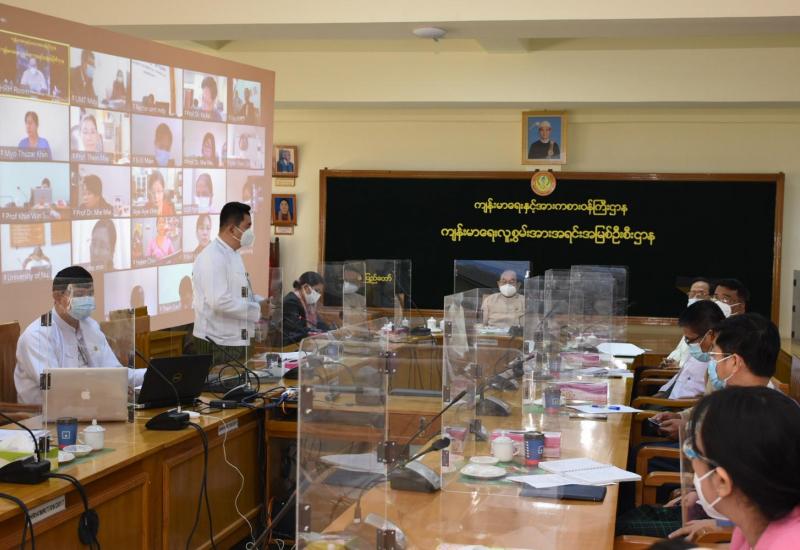 ဆေးပညာနှီးနွှယ် တက္ကသိုလ် (၇) ခု၏ နောက်ဆုံးနှစ် (၁/၂၀၂၀) (ပုံမှန်) သင်တန်းများ ပြန်လည်ဖွင့်လှစ်နိုင်ရေးနှင့် သင်ကြားရေးစနစ် ပိုမိုကောင်းမွန်စေရေး ညှိနှိုင်းအစည်းအဝေးကို ယနေ့နံနက်ပိုင်းတွင် ကျန်းမာရေးလူ့စွမ်းအားအရင်းအမြစ်ဦးစီးဌာန၌ ဗီဒီယိုကွန်ဖရင့်စနစ်ဖြင့် ကျင်းပသည်။