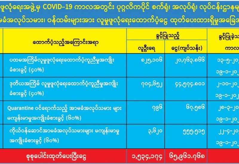 COVID-19 ကာလအတွင်း လူမှုဖူလုံရေးအဖွဲ့မှ လူမှုဖူလုံရေးအကျုံးဝင် ပုဂ္ဂလိကပိုင် စက်ရုံ၊ အလုပ်ရုံ၊ လုပ်ငန်းဌာနများရှိအာမခံအလုပ်သမားများအား လူမှုဖူလုံရေးထောက်ပံ့ငွေများအား ခွင့်ပြုထုတ်ပေးလျက်ရှိရာ COVID-19-19 1st Wave အတွက် ၁၃-၅-၂၀၂၀ရက်နေ့မှ ၁၉-၁-၂၀၂၁ ရက်နေ့အထိ စက်ရုံ၊ အလုပ်ရုံ၊ လုပ်ငန်းဌာန စုစုပေါင်း (၇၂၆၂) ဌာနမှ အာမခံ အလုပ်သမား (၈၂၅,၁၀၆) ဦးအတွက် ထောက်ပံ့ငွေကျပ်သန်း (၂၀,၇၆၃ . ၈၆၆) အား လည်းကောင်း။