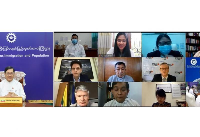 အထည်ချုပ်ကဏ္ဍအတွက် ကိုဗစ်-၁၉ အထောက်အပံ့အဖြစ် ဥရောပသမဂ္ဂ မြန်ကူ ထောက်ပံ့ကြေးငွေ အစီအစဉ်အပေါ် နှစ်ကုန်ပြန်လည်သုံးသပ်မှုနှင့် ဆက်လက်ဆောင်ရွက်မည့် လုပ်ငန်းစဉ်များ ညှိနှိုင်းရေး ဆွေးနွေးပွဲကို ယနေ့မွန်းလွဲ ၂ နာရီတွင် အလုပ်သမား၊ လူဝင်မှုကြီးကြပ်ရေးနှင့် ပြည်သူ့အင်အား ဝန်ကြီးဌာန အစည်းအဝေးခန်းမ၌ ဗီဒီယို ကွန်ဖရင့်စနစ်ဖြင့်ကျင်းပသည်။