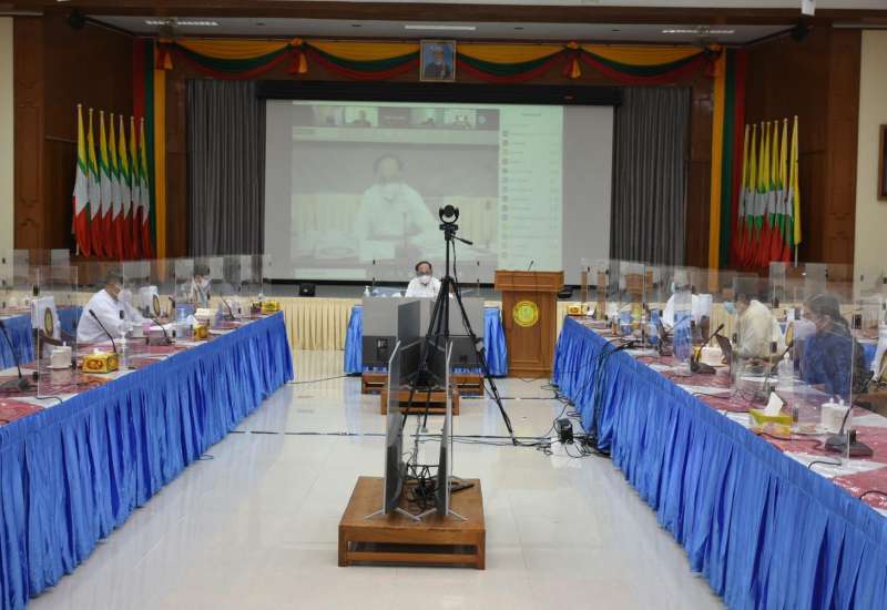 တိုင်းဒေသကြီး/ ပြည်နယ်များတွင် ကိုဗစ်-၁၉ ဖြစ်ပွားကူးစက်မှု အခြေအနေနှင့် တစ်ပြည်လုံး အတိုင်းအတာဖြင့် ရောဂါဖြစ်ပွားမှုများသော မြို့နယ်များ အားလုံး၌ ဆောင်ရွက်နေသော ပါးစပ်နှင့် နှာခေါင်းစည်း မဖြစ်မနေတပ်ဆင်ရေး လူထုလှုပ်ရှား စီမံချက် ဆောင်ရွက်နေမှုများအား အသေးစိတ် တင်ပြဆွေးနွေးခြင်း အစည်းအဝေးကို ယမန်နေ့ က ဗီဒီယိုကွန်ဖရင့် စနစ်ဖြင့် ကျင်းပရာ ကျန်းမာရေးနှင့်အားကစားဝန်ကြီးဌာန၊ ပြည်ထောင်စုဝန်ကြီး ဒေါက်တာမြင့်ထွေး တက်ရောက် အမှာစကားပြောကြားသည်။