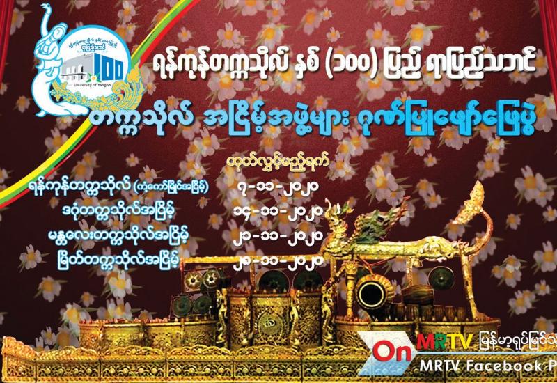 ဒီဇင်ဘာ ၁ ရက်တွင် ကျရောက်မည့် ရန်ကုန်တက္ကသိုလ် နှစ်(၁၀၀) ပြည့်၊ ရာပြည့်သဘင်အား ဂုဏ်ပြုသောအားဖြင့် တက္ကသိုလ်အငြိမ့်အဖွဲ့များ၏ ဖျော်ဖြေပွဲများကို မြန်မာ့အသံနှင့် ရုပ်မြင်သံကြားမှ ထုတ်လွှင့်တင်ဆက်နိုင်ရန် ပြန်ကြားရေးဝန်ကြီးဌာနနှင့် ပညာရေးဝန်ကြီးဌာနတို့ ပူးပေါင်း၍ ကျန်းမာရေးဆိုင်ရာ ညွှန်ကြားချက်များ အထူးဂရုပြုပြီး စီစဉ်ဆောင်ရွက် လျက်ရှိသည်။