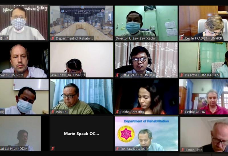 ကချင်ပြည်နယ်အတွင်းရှိ နေရပ်စွန့်ခွာရသူများ (IDPs) ပြန်လည်နေရာချမှု အကောင်အထည် ဖော်ရေးဆိုင်ရာ လုပ်ငန်းများ ဆောင်ရွက်ရာတွင် UN Agency များ၏ ကဏ္ဍအလိုက် ညှိနှိုင်းမှု သေချာစေရေးအတွက် နည်းပညာဆိုင်ရာ ညှိနှိုင်းရေးအဖွဲ့၏ လုပ်ငန်းလမ်းညွှန် (ToR) မူကြမ်း ရေးဆွဲနိုင်ရေးအတွက် ညှိနှိုင်းအစည်းအဝေးအား ယနေ့ညနေပိုင်းတွင် ဗီဒီယိုကွန်ဖရင့်ဖြင့် ကျင်းပ သည်။