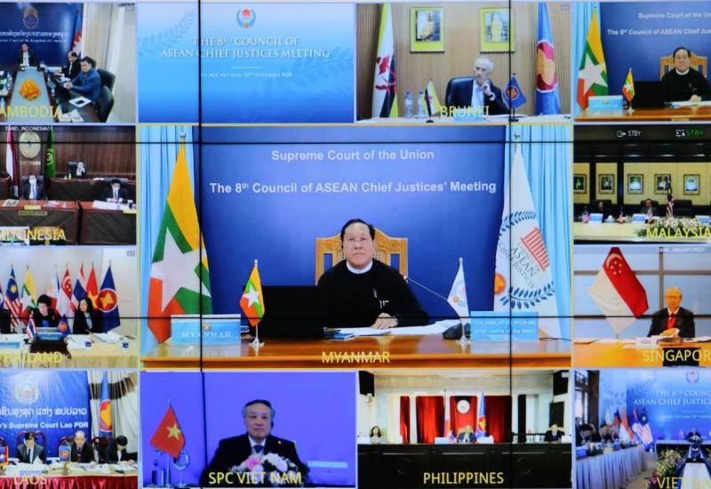 ပြည်ထောင်စုတရားသူကြီးချုပ် ဦးထွန်းထွန်းဦးသည် ယနေ့နံနက်ပိုင်းတွင် ဗီဒီယိုကွန်ဖရင့်စနစ်ဖြင့် ကျင်းပသည့် (၈) ကြိမ်မြောက် အာဆီယံတရားသူကြီးချုပ်များ ကောင်စီ အစည်းအဝေး (The 8th Meeting of the Council of ASEAN Chief Justices)" သို့ နေပြည်တော်ရှိ ပြည်ထောင်စု တရားလွှတ်တော်ချုပ်မှ ပါဝင်တက်ရောက်သည်။