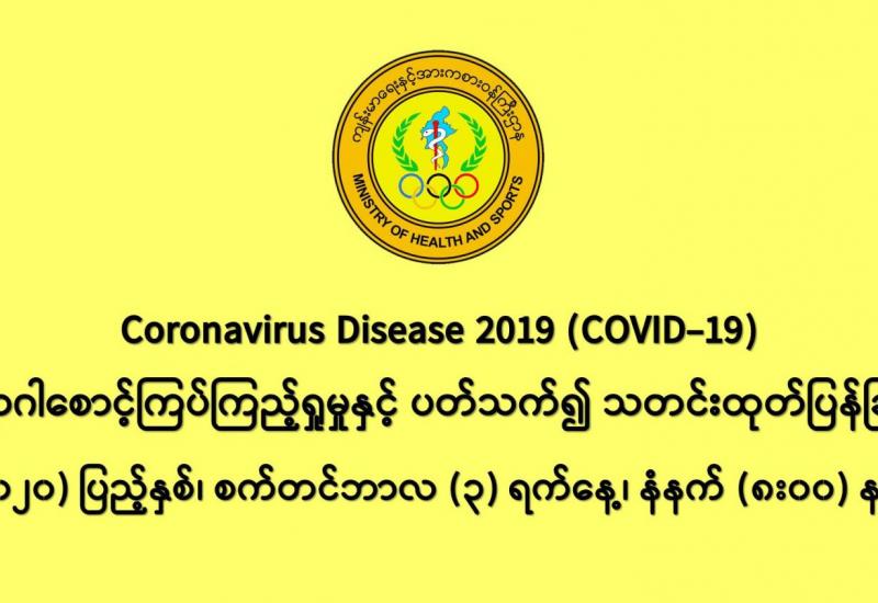မြန်မာနိုင်ငံတွင် သြဂုတ်လ ၃၁ ရက် ညပိုင်းနှင့် စက်တင်ဘာလ ၁ ရက်နေ့ နံနက်ပိုင်း နောက်ဆုံးဓာတ်ခွဲစစ်ဆေးချက်များအရ ကိုရိုနာဗိုင်းရပ်စ်ပိုး ကူးစက်ခံရသူဦးရေ ၁၀၀ ပေါ်ထွက်ခဲ့ပြီး အတည်ပြုလူနာ စံချိန်ကျိုးခဲ့ပါသည်။ ထို ၁၀၀ ထဲတွင် ၁၈ ဦးသည် သြဂုတ်လအတွင်း ရခိုင်ပြည်နယ်နှင့် ပြည်ပခရီးသွား ရာဇဝင်မရှိသူများ၊ ပိုးတွေ့ အတည်ပြုလူနာနှင့် ထိတွေ့မှု မရှိသူများ ဖြစ်နေသည်။