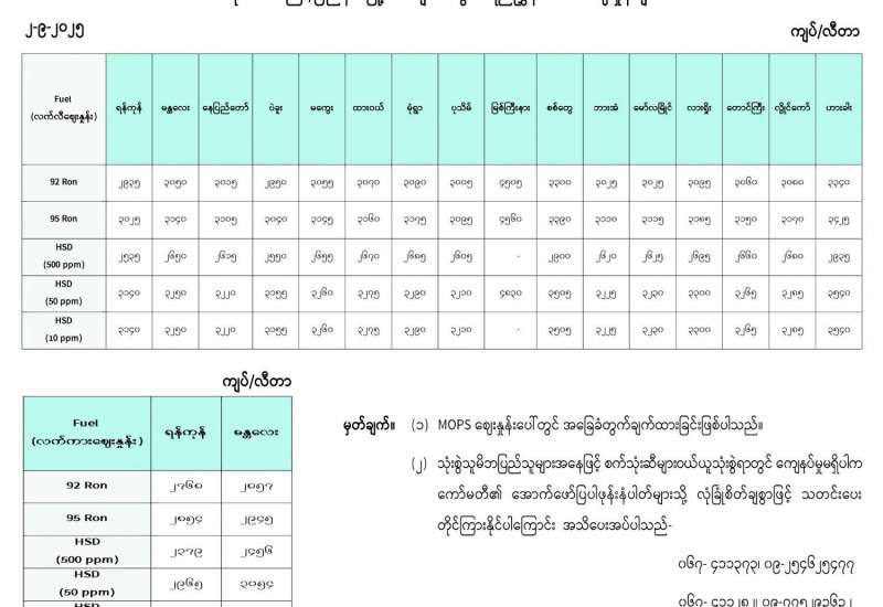 ရန်ကုန်မြို့နှင့် မန္တလေးမြို့အတွက် ရည်ညွှန်းလက်ကားဈေးနှုန်းများနှင့် ပြည်ထောင်စုနယ်မြေ နေပြည်တော်၊ တိုင်းဒေသကြီး/ပြည်နယ် မြို့တော်များအတွက် ရည်ညွှန်းလက်လီဈေးနှုန်းများ